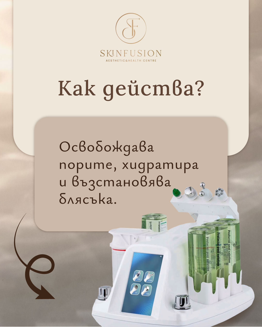 Процедурата е неинвазивна и съчетава аквапилинг с вакуумна технология за дълбоко почистване, йонен лифтинг, мултиполярна радиочестота и ултразвук за стимулиране на колагена и обновяване на кожата.